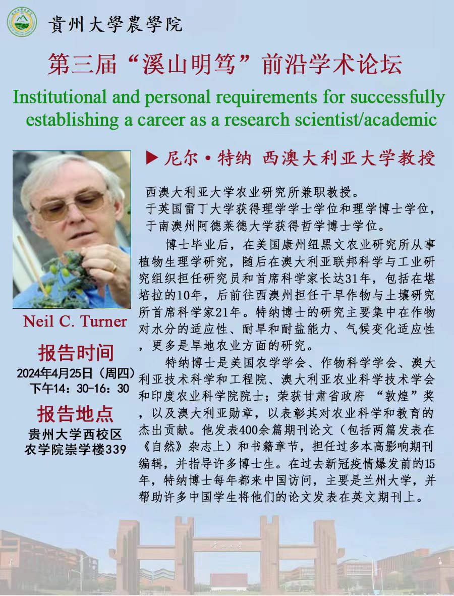 4月25 西澳大利亚大学农业研究所Neil C.Turner 教授学术讲座Institutional and personal requirements for successfullyestablishing a career as a research scientist/academic